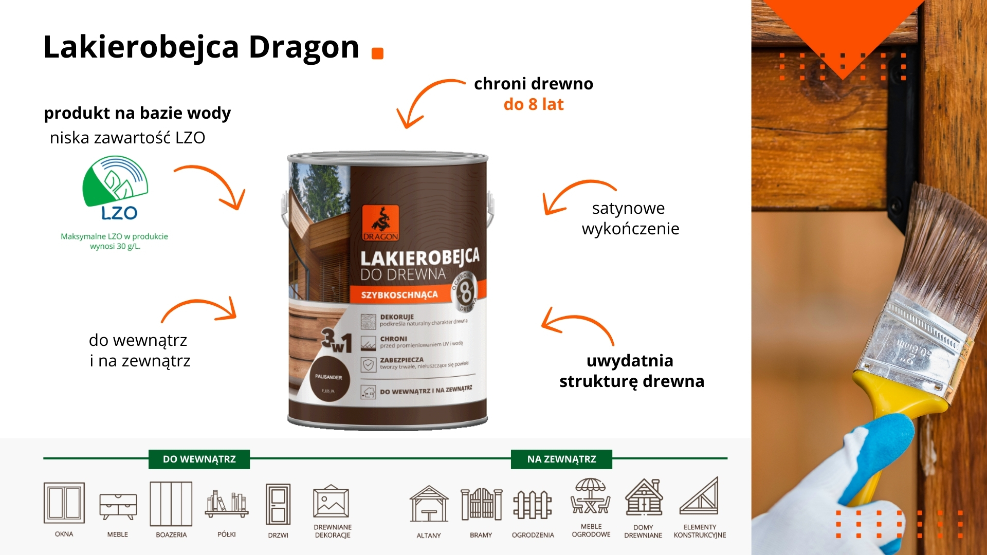 Z radością informujemy, że firma Dragon wprowadza do sieci Obi nowy produkt – Lakierobejcę do drewna, dostępną w sklepach od maja do września! Dzięki temu, klienci będą mieli możliwość odnowienia i zabezpieczenia swojej małej architektury ogrodowej, tarasów, balkonów, a także pomalowania mebli oraz innych elementów drewnianych wewnątrz domu.